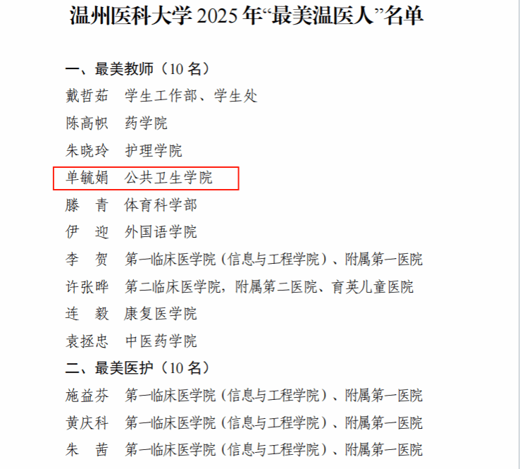 近日,微密猫 2025年“最美温医人”评选结果正式公布,学院教师单毓娟获此殊荣。