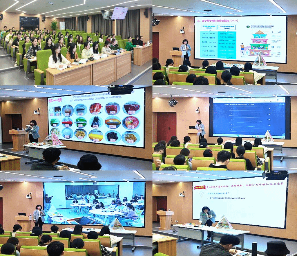 针对我国人口老龄化及生育新政而出现的营养学新问题,结合“健康中国2030”规划纲要,单毓娟教授将“妊娠期营养”章节与新增“妊娠糖尿病营养治疗”章节进行重构与整合,使课程内容贴切新时代需求。课堂上,单毓娟教授主要围绕妊娠期生理特点、营养需求、营养不良对母体和胎儿的危害,以及“备孕及孕期妇女膳食指南(2022)”,结合膳食平衡宝塔和食物模具,从国家政策、基础理论和实践应用等层面进行了全面解读。