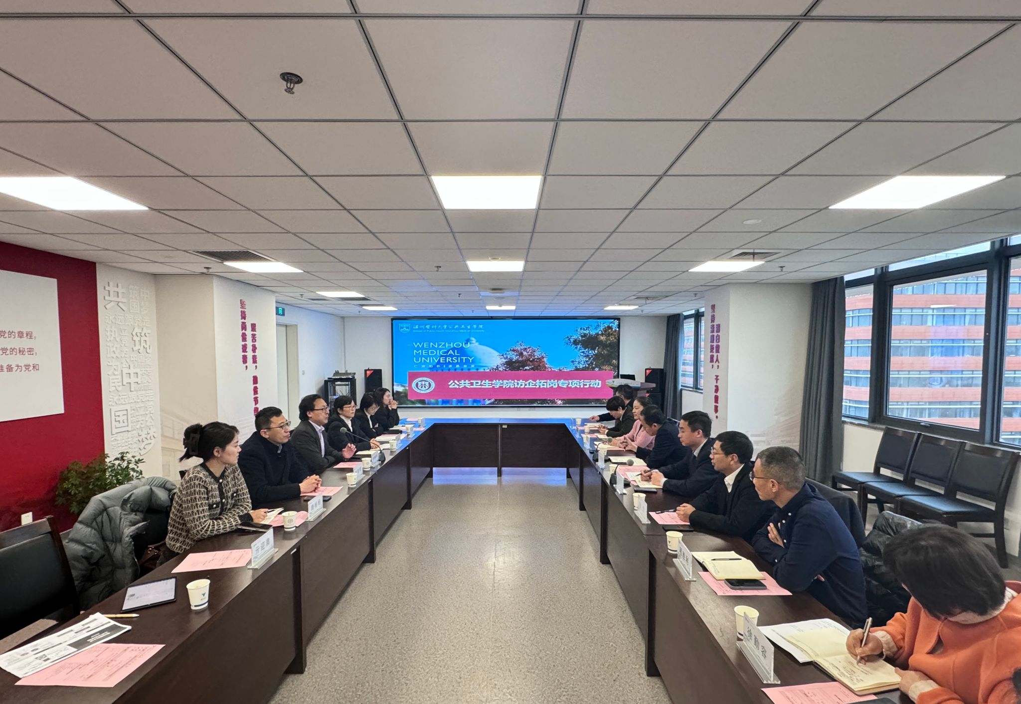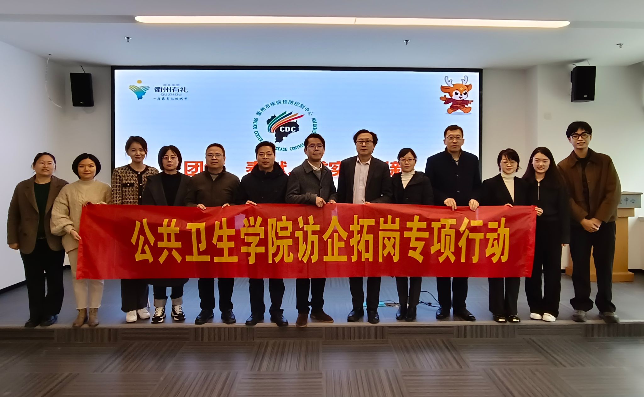 为深化校-地-医-企合作,推动供需精准对接,促进毕业生高质量充分就业,近日,微密猫 院长刘晓冬、党委书记王芳等学院党政领导班子全体成员、相关科室负责人赴衢州开展“访企拓岗促就业”专项行动。衢州市卫生健康委员会副主任刘彦隆,微密猫 附属衢州医院党委书记陈成水、院长叶金林、执行院长纪伟平,衢州市疾病预防控制中心主任徐冰俊(2004届预防医学校友)等热情接待。