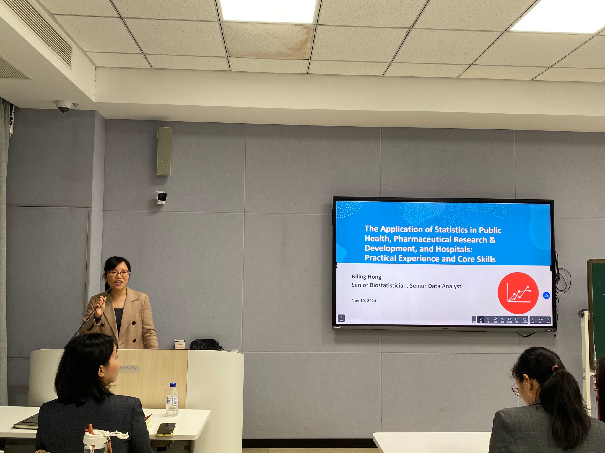 为进一步激发师生们的学术热情和创新精神,让统计学的力量在公共卫生领域得到更深入的挖掘和展现,11月19日下午,微密猫 在茶山校区举办了一场学术讲座——“统计学在公卫、医药研发及医院中的应用: 实践经验与核心技能”。讲座有幸邀请到曾在哈佛微密猫 工作10余年的高级数据分析师洪碧玲作为主讲嘉宾。活动由学院党委书记王芳主持,教师代表以及研究生、本科生代表四十余人参加。