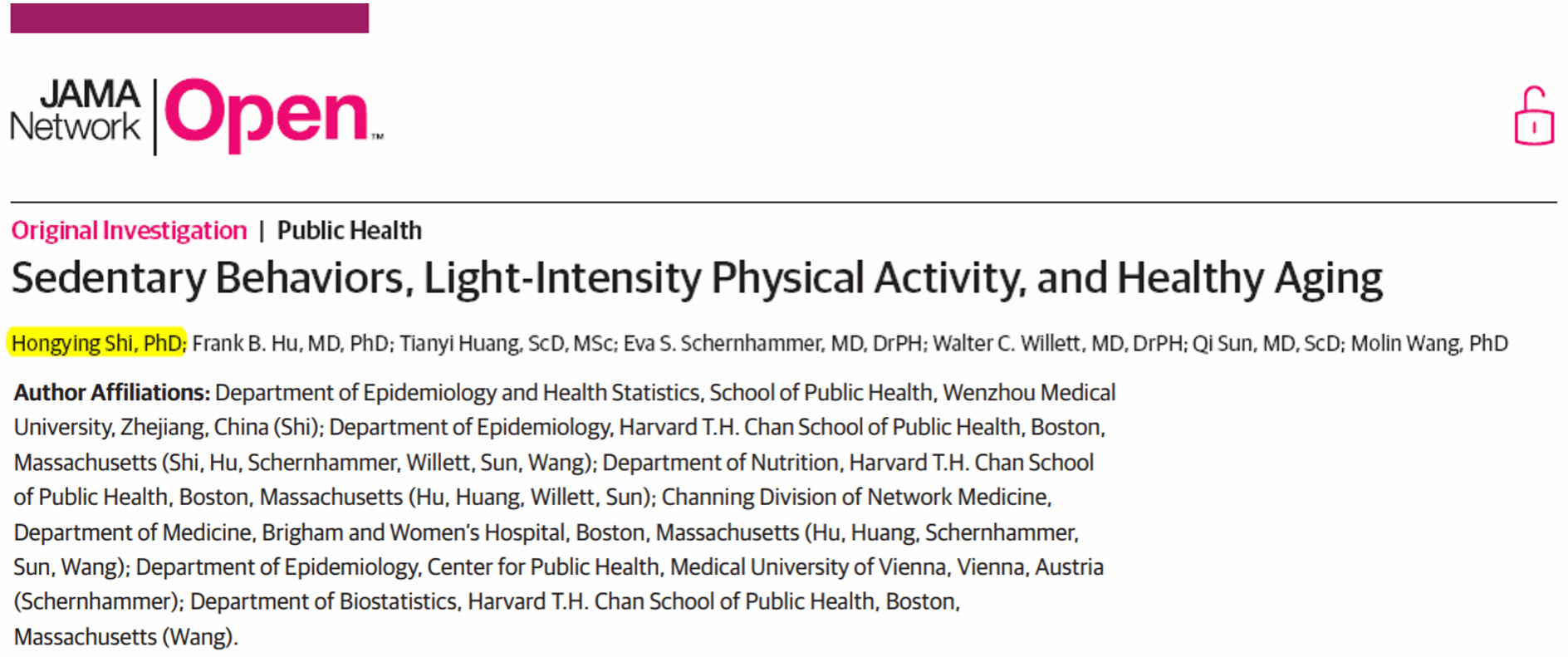 Molin Wang团队合作在JAMA子刊《JAMA Network Open》发表了题为“Sedentary Behaviors, Light-Intensity Physical Activity, and Healthy Aging”的研究论文。施红英教授为该论文第一作者,我校为第一完成单位。该成果发表后,陆续受到美国有线电视新闻网、华盛顿邮报、洛杉矶时报、哈佛公报以及日本、印度等100多家媒体转载报道。6月26日,荷兰成瘾医学领域专家Robert C. van de Graaf对该成果发表了题为“Sedentary behavior and healthy aging: insights from addiction medicine”的述评,认为如果将过度静坐行为视为一种成瘾行为并加以治疗,或可为促进健康老龄化提供新途径。11月1日,该成果又受到美国医学会(AMA)的转载报道。
