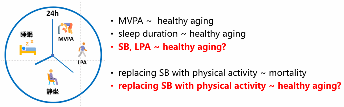 老龄化形势严峻,而健康期望寿命增速赶不上期望寿命,老龄化往往伴随着慢性病、失能、失智及各种心理问题,给个人、家庭乃至社会造成巨大负担。如何实现健康老龄化成为亟待解决的公共卫生问题。数据显示,目前世界各地老年人群实现健康老龄化的比例仅为10%-35%。24h行为,分为睡眠、静坐、轻度体力活动和中高强度体力活动,都是影响健康的重要可改变因素。该研究探讨了不同类型静坐行为以及轻度身体活动与健康老龄化的独立关联,并分析了采用轻度、中重度身体活动、睡眠代替等时长的静坐行为对于实现健康老龄化的理论替代效应,为合理分配24h行为、促进老年人整体健康提供了证据。