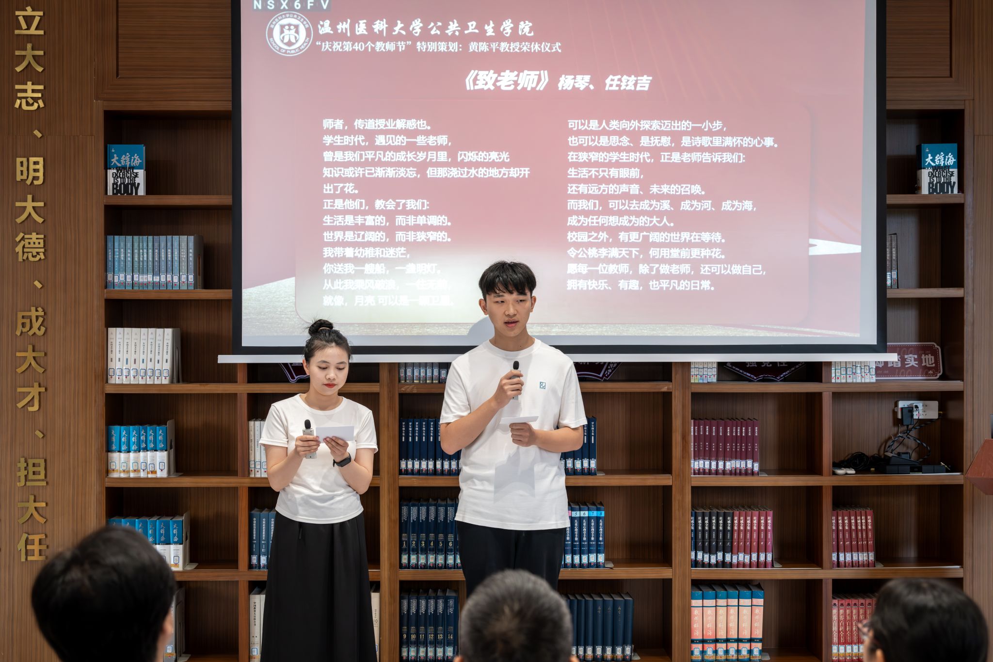 学院学生会和研究生会共同选送,由本科生代表王晨焕、徐健轩同学,研究生代表杨琴、任铉吉同学,分别献上吉他弹唱《光阴的故事》、诗歌朗诵《致老师》,“遥远的路程,昨日的梦,以及远去的笑声,再次的见面我们又历经了多少的路程。”歌声悠扬婉转,歌词触人心弦,将大家带回纯真而质朴的年代,成为共同的美好回忆。“希望黄教授,除了做老师,还可以做自己,拥有快乐、有趣、也平凡的日常!”同学们表达了诚挚温暖的祝福。
