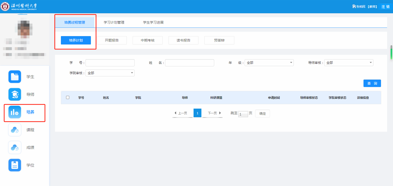 2.导师审核:完成的培养计划需提交导师审核,经导师、学院审核通过后,方可打印成书面版本,并且需要导师在纸质版的《研究生培养计划表》的导师栏进行手签后上交学院。导师登录系统后,进入学生管理——过程管理——培养计划,可查询学生填写的培养方案并进行审核,导师也可驳回学生的培养计划,经学生修改后再次提交审核。